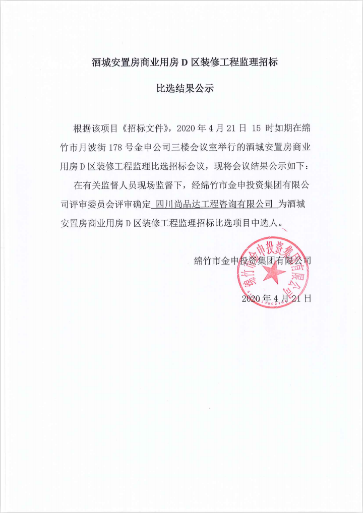 酒城安置房商業(yè)用房D區裝修工程監理招標比選結果公示