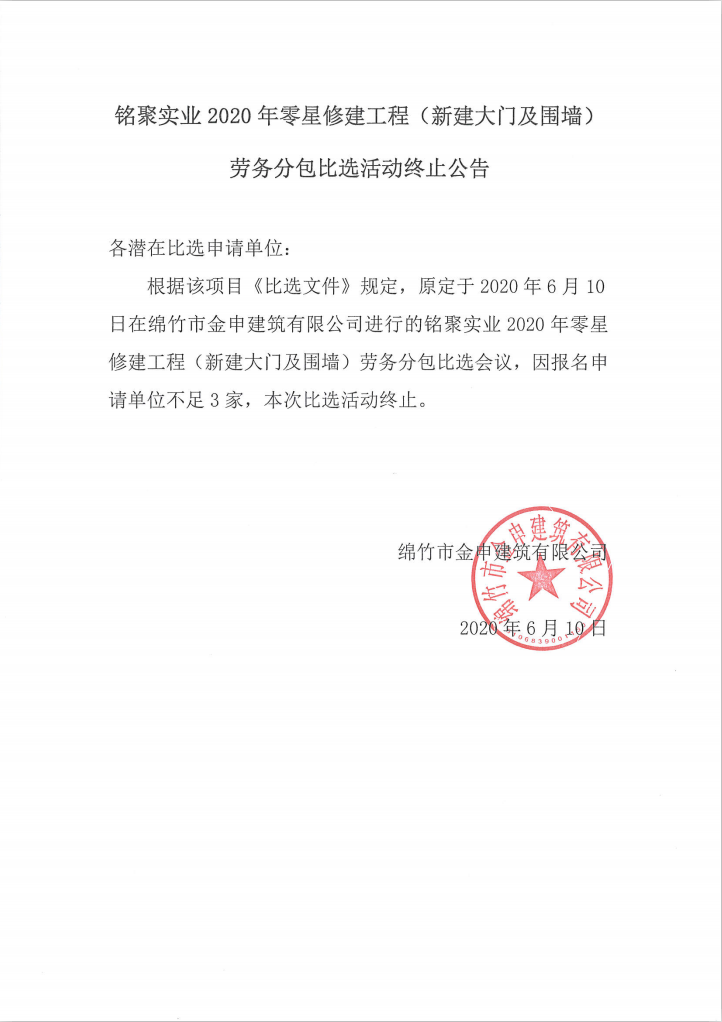 銘聚實(shí)業(yè)2020年零星修建工程勞務(wù)分包比選活動(dòng)終止公告