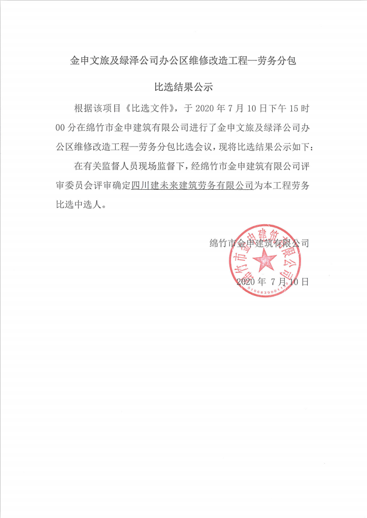 金申文旅及綠澤公司辦公區改造工程--勞務(wù)分包比選結果公示