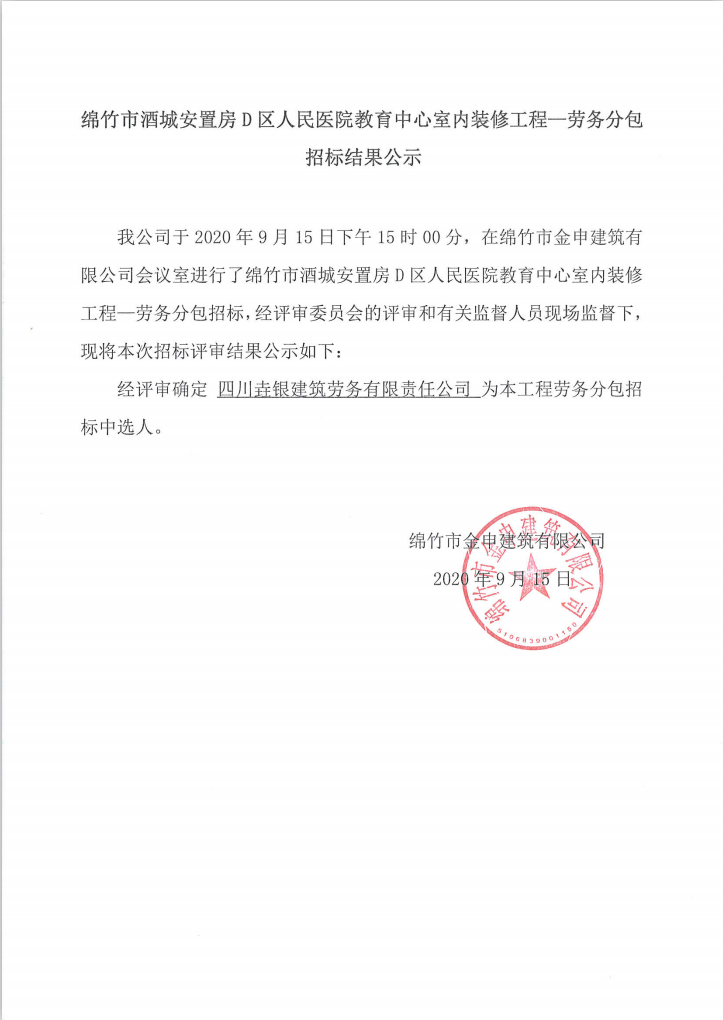 人民醫院教育中心室內裝修工程—勞務(wù)招標結果公示