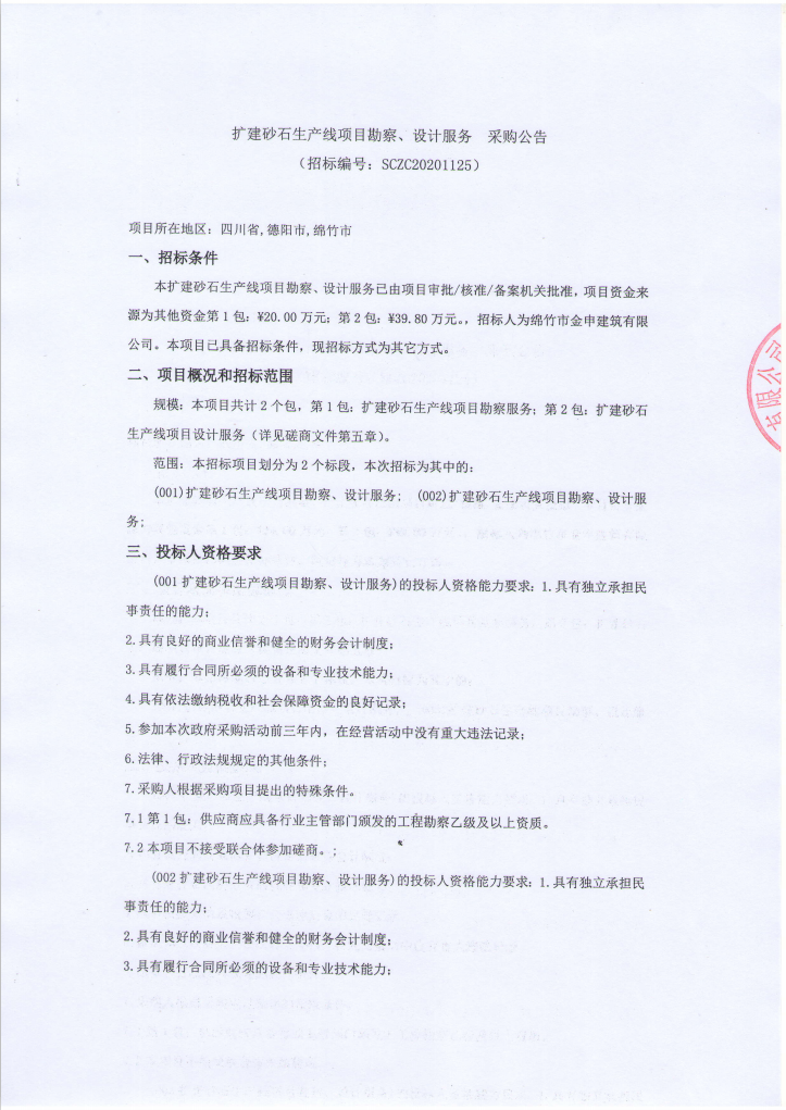 擴建砂石生產(chǎn)線(xiàn)項目勘察、設計服務(wù)采購公告