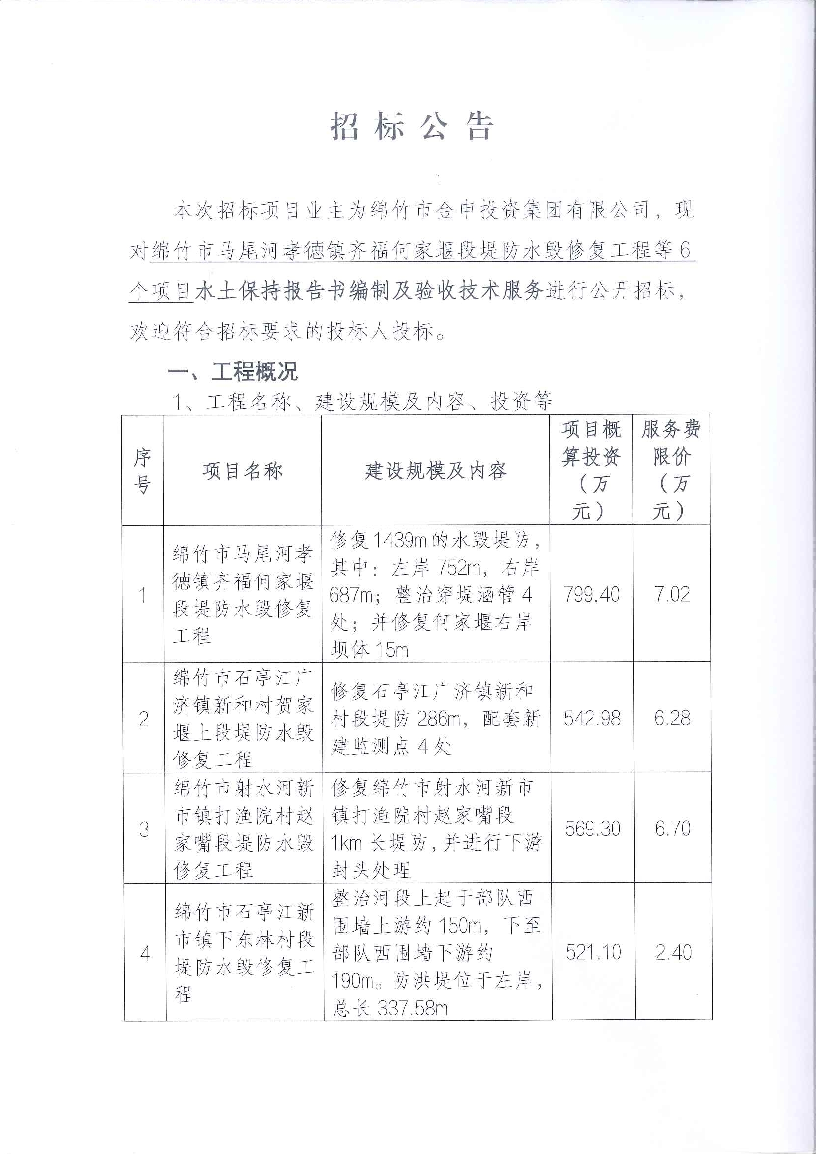 馬尾河何家堰段堤防水毀等6個(gè)項目水保編制服務(wù)招標公告