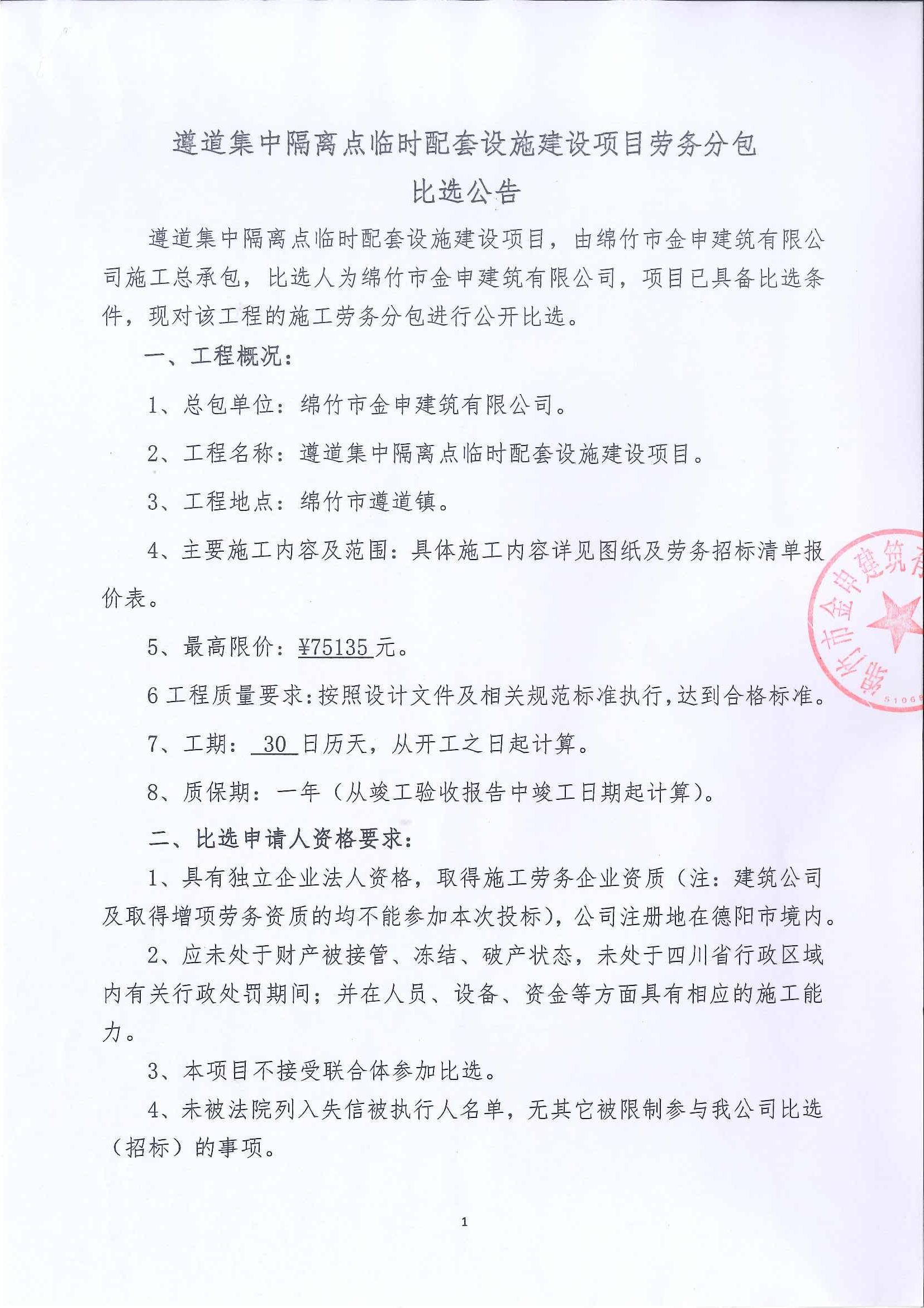 遵道集中隔離點(diǎn)臨時(shí)配套設施建設項目勞務(wù)分包比選公告