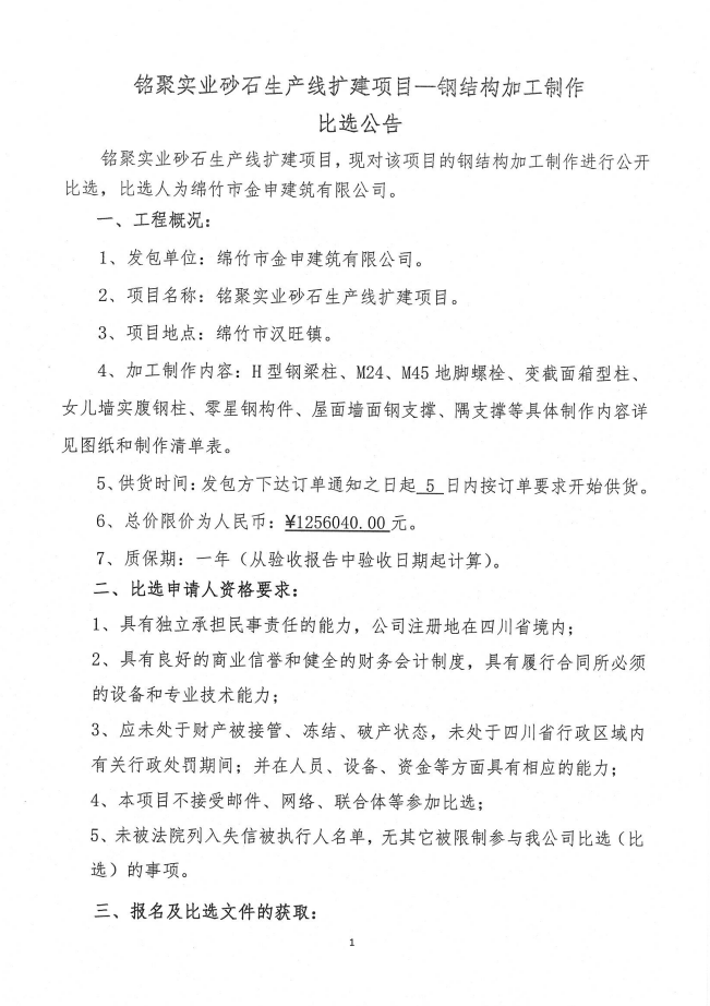 銘聚實(shí)業(yè)砂石生產(chǎn)線(xiàn)擴建項目—鋼結構加工制作比選公告