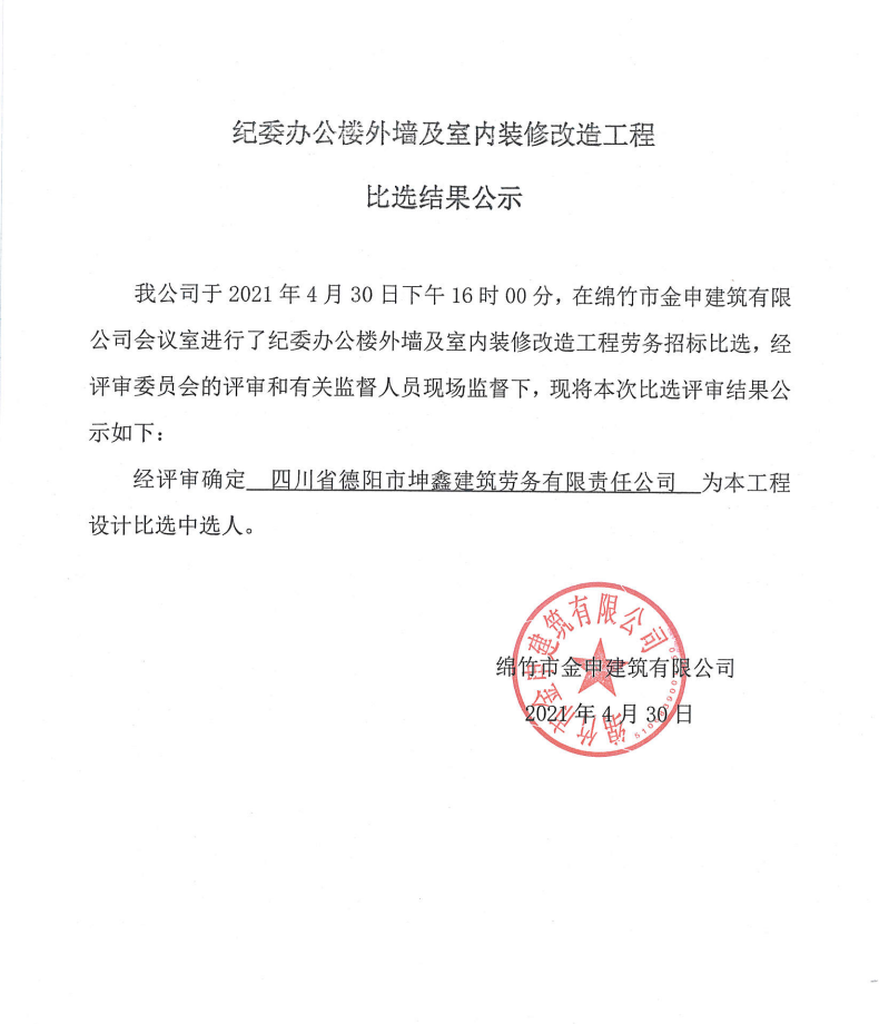 紀委辦公樓外墻及室內裝修改造工程勞務(wù)分包比選結果公示