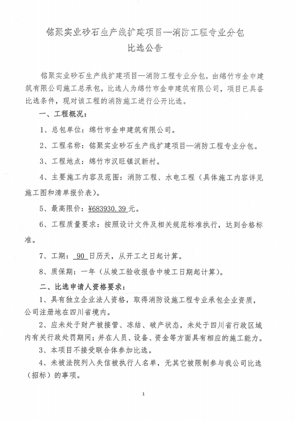銘聚實(shí)業(yè)砂石生產(chǎn)線(xiàn)擴建項目—消防工程專(zhuān)業(yè)分包比選公告