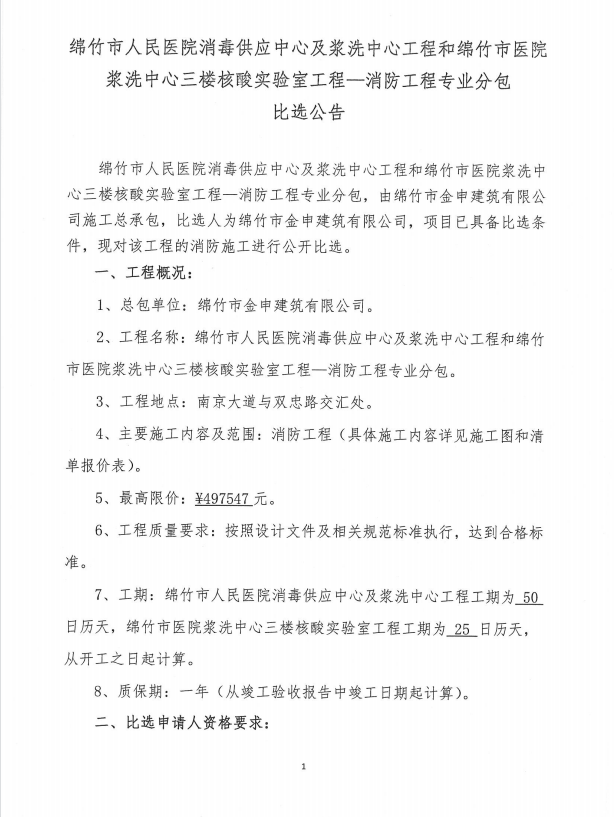 綿竹市人民醫院部分工程—消防工程專(zhuān)業(yè)分包比選公告