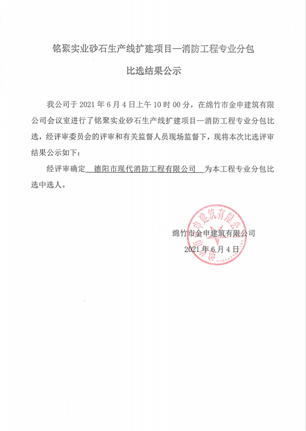 銘聚實(shí)業(yè)砂石生產(chǎn)線(xiàn)擴建項目—消防工程分包比選結果公示