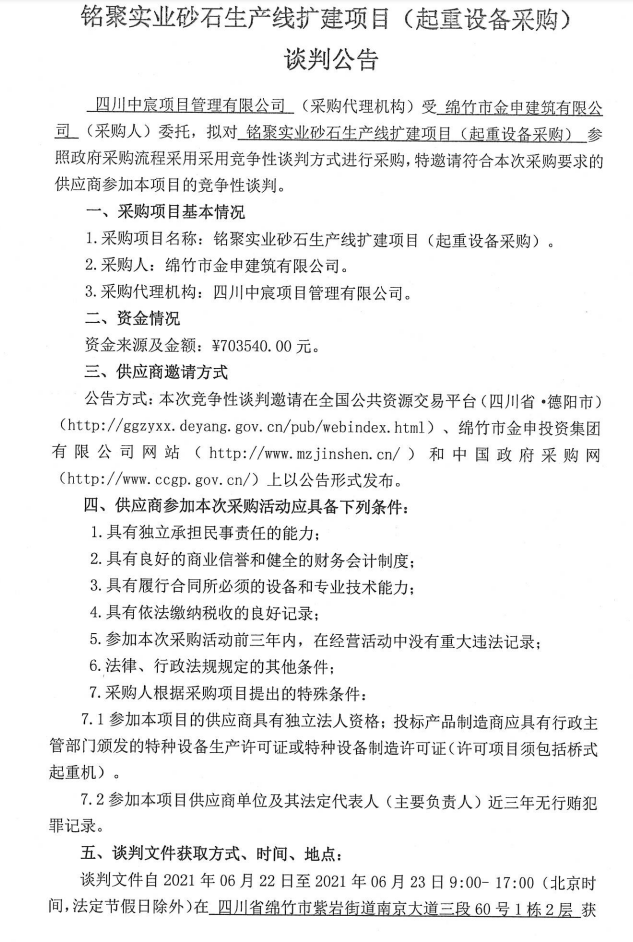 銘聚實(shí)業(yè)砂石生產(chǎn)線(xiàn)擴建項目起重設備采購談判公告