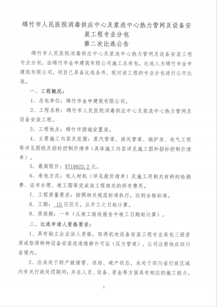 市醫院消供、漿洗中心熱力網(wǎng)管及設備安裝工程二次比選