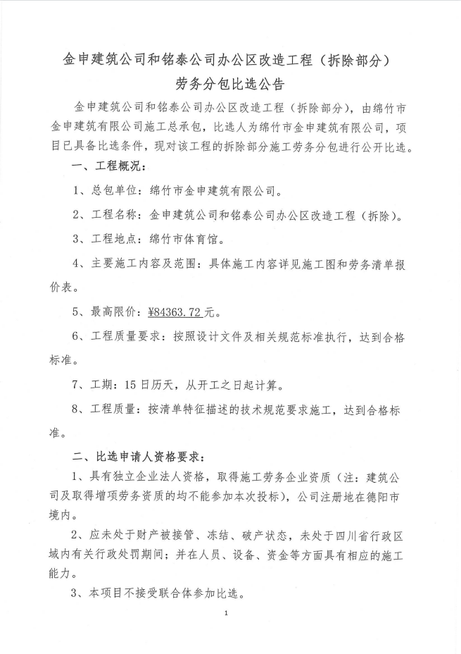 金申建筑和銘泰公司辦公區改造工程勞務(wù)分包比選公告