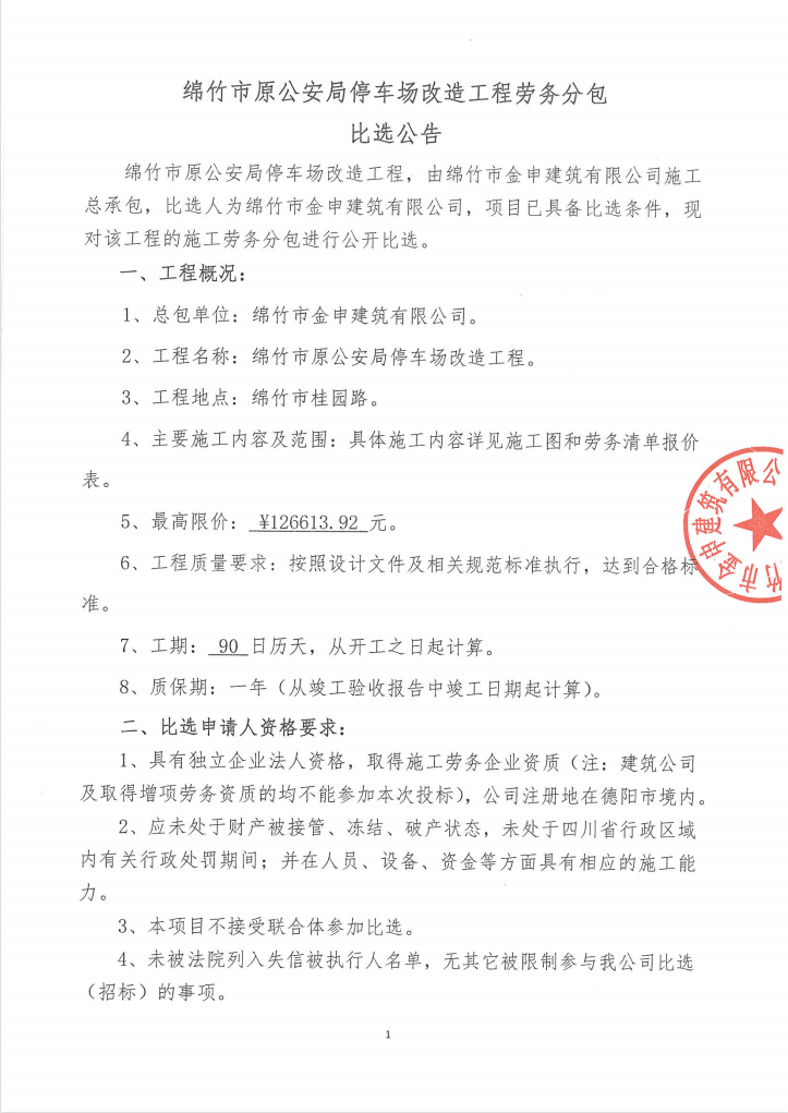 綿竹市原公安局停車(chē)場(chǎng)改造工程勞務(wù)分包比選公告