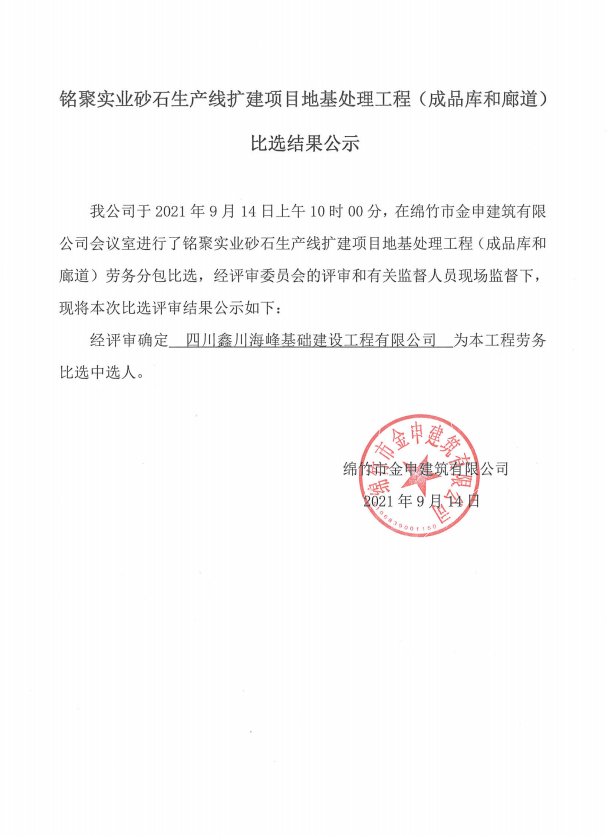 銘聚實(shí)業(yè)砂石生產(chǎn)線(xiàn)擴建項目地基處理工程比選結果公示