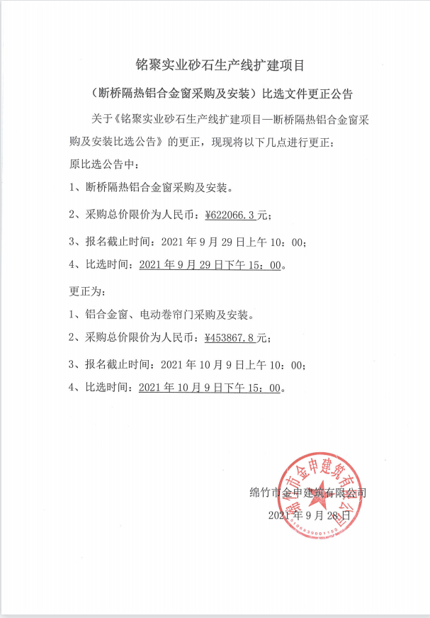 銘聚實(shí)業(yè)砂石生產(chǎn)線(xiàn)擴建項目比選文件更正公告