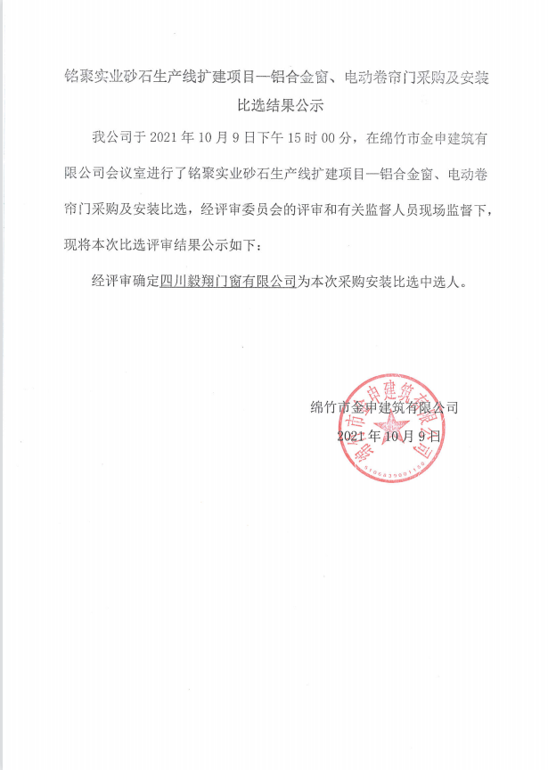 銘聚砂石生產(chǎn)線(xiàn)項目—窗、門(mén)采購及安裝比選結果公示