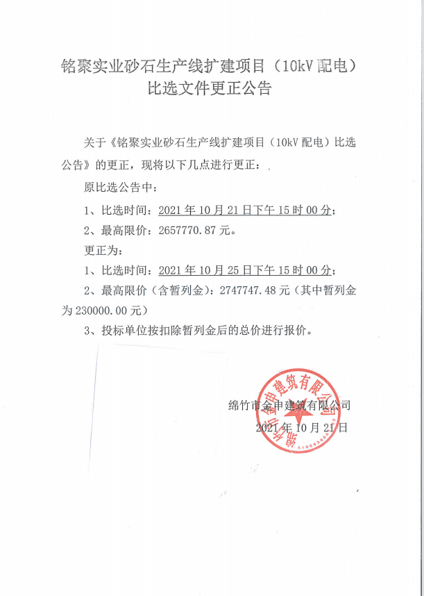 銘聚實(shí)業(yè)砂石生產(chǎn)線(xiàn)擴建項目(10kV配電)比選文件更正公告