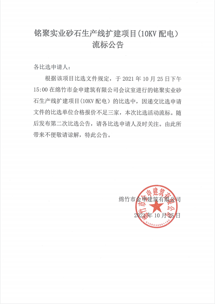 銘聚實(shí)業(yè)砂石生產(chǎn)線(xiàn)擴建項目(10kV配電)流標公告