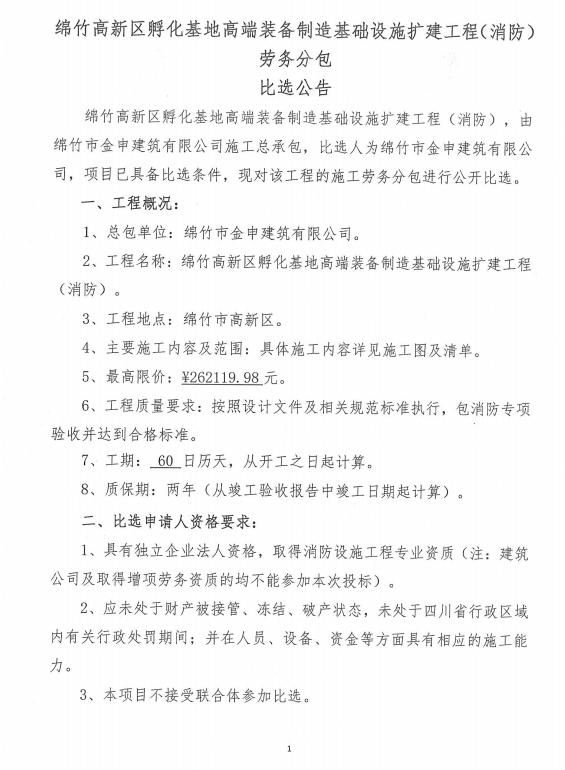 高新區高端裝備制造基礎設施(消防)勞務(wù)分包比選公告