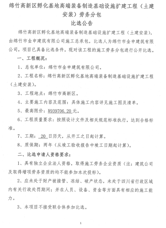 高新區高端裝備制造基礎設施(土建安裝)比選公告