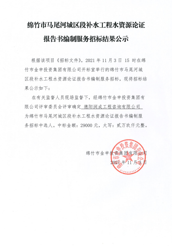 馬尾河城區段補水工程水資源論證書(shū)編制服務(wù)招標結果公示