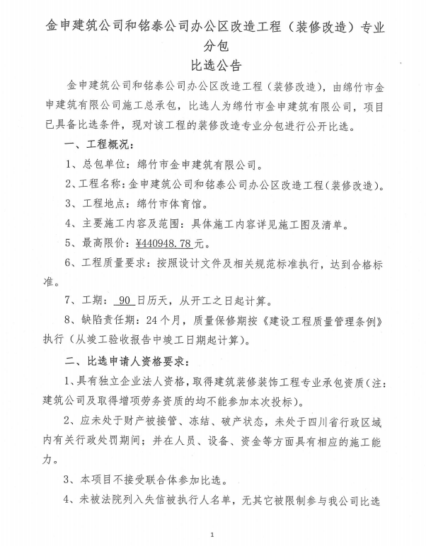 建筑、銘泰公司辦公區改造工程專(zhuān)業(yè)分包比選公告