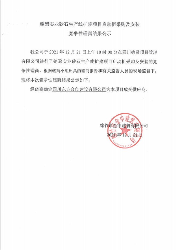 銘聚砂石生產(chǎn)線(xiàn)擴建項目啟動(dòng)柜采購及安裝招標結果公示