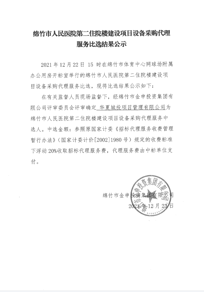市醫院第二住院樓建設項目設備采購代理服務(wù)比選結果公示