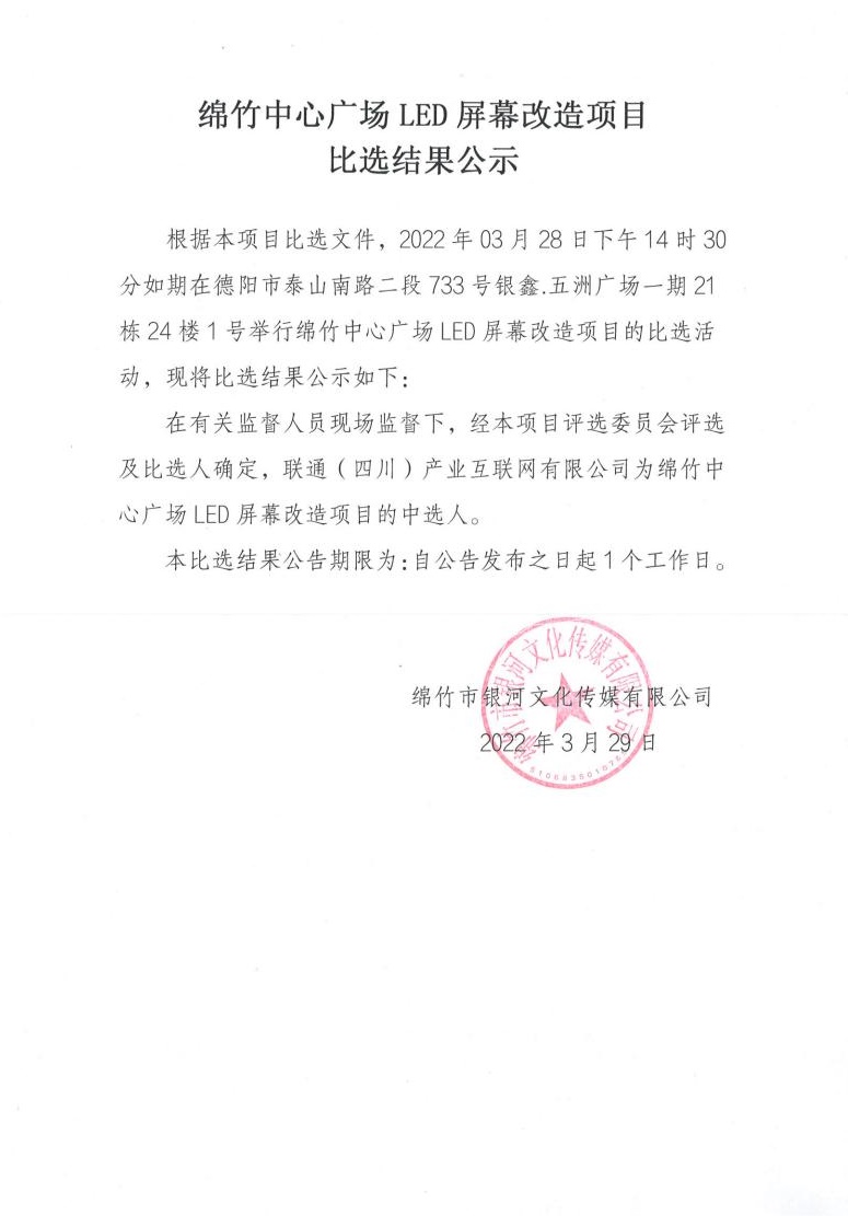 綿竹中心廣場(chǎng)LED屏幕改造項目比選結果公示
