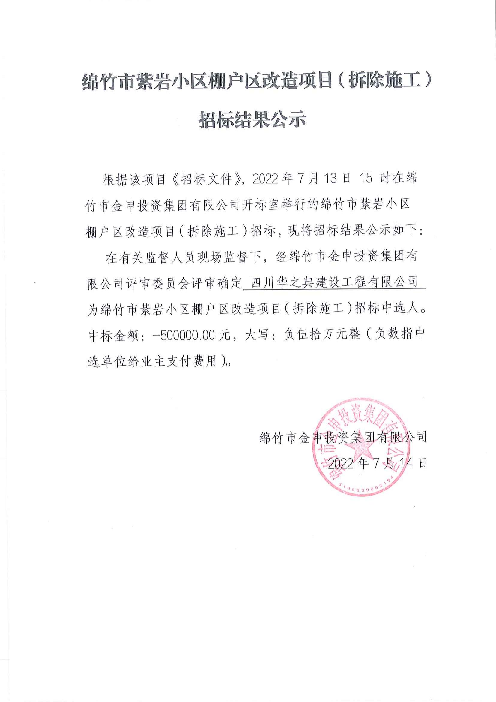 綿竹市紫巖小區棚戶(hù)區改造項目(拆除施工)招標結果公示